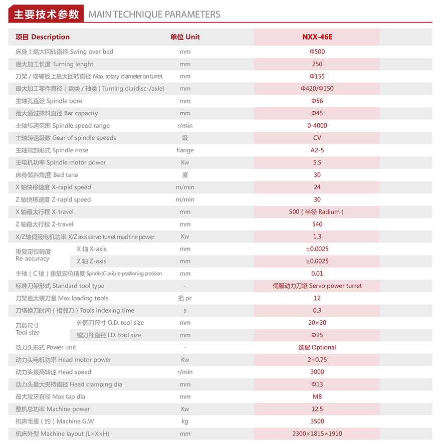 CNC system: Taiwan Syntec Spindle parts: Domestic or Taiwan Posa Spindle servo motor/Driver: Beijing CTB or Taiwan Syntec X/Z axis servo motor/Driver: Taiwan Syntec or Yaskawa, Japan X/Z axis ball screw: Taiwan PMI or Hiwin | X/Z axis linear guide: Taiwan PMI or Hiwin Turret: Taiwan servo power turret Power head servo turret: Taiwan Syntec or Yaskawa, Japan Bed base: Cast iron base Electrical components: Schneider, France |